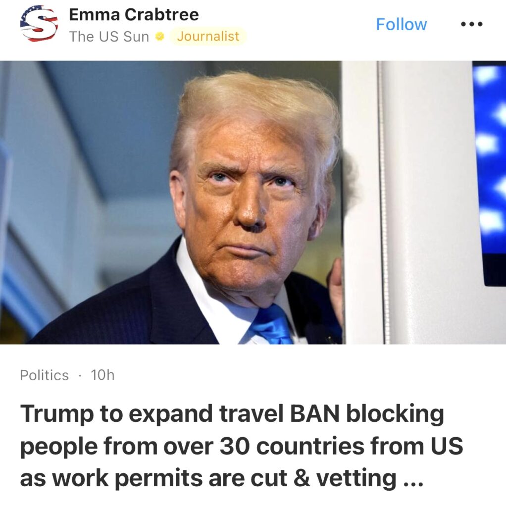 6。据The US Sun报道,特朗普将扩大旅行禁令,禁止30多个国家的公民入境美国,同时削减工作许可并加强审查。