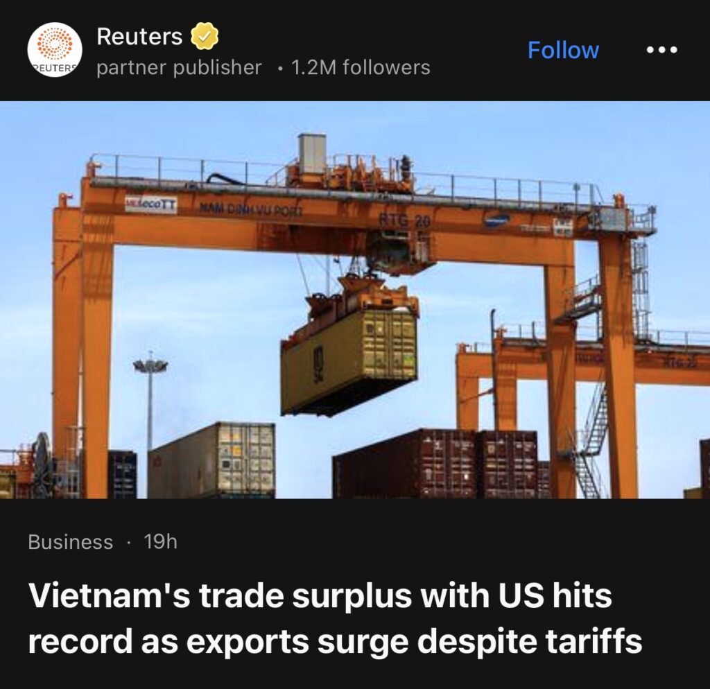 11。据Reuters报道,尽管面临关税,越南对美贸易顺差仍创历史新高,出口大幅增长。