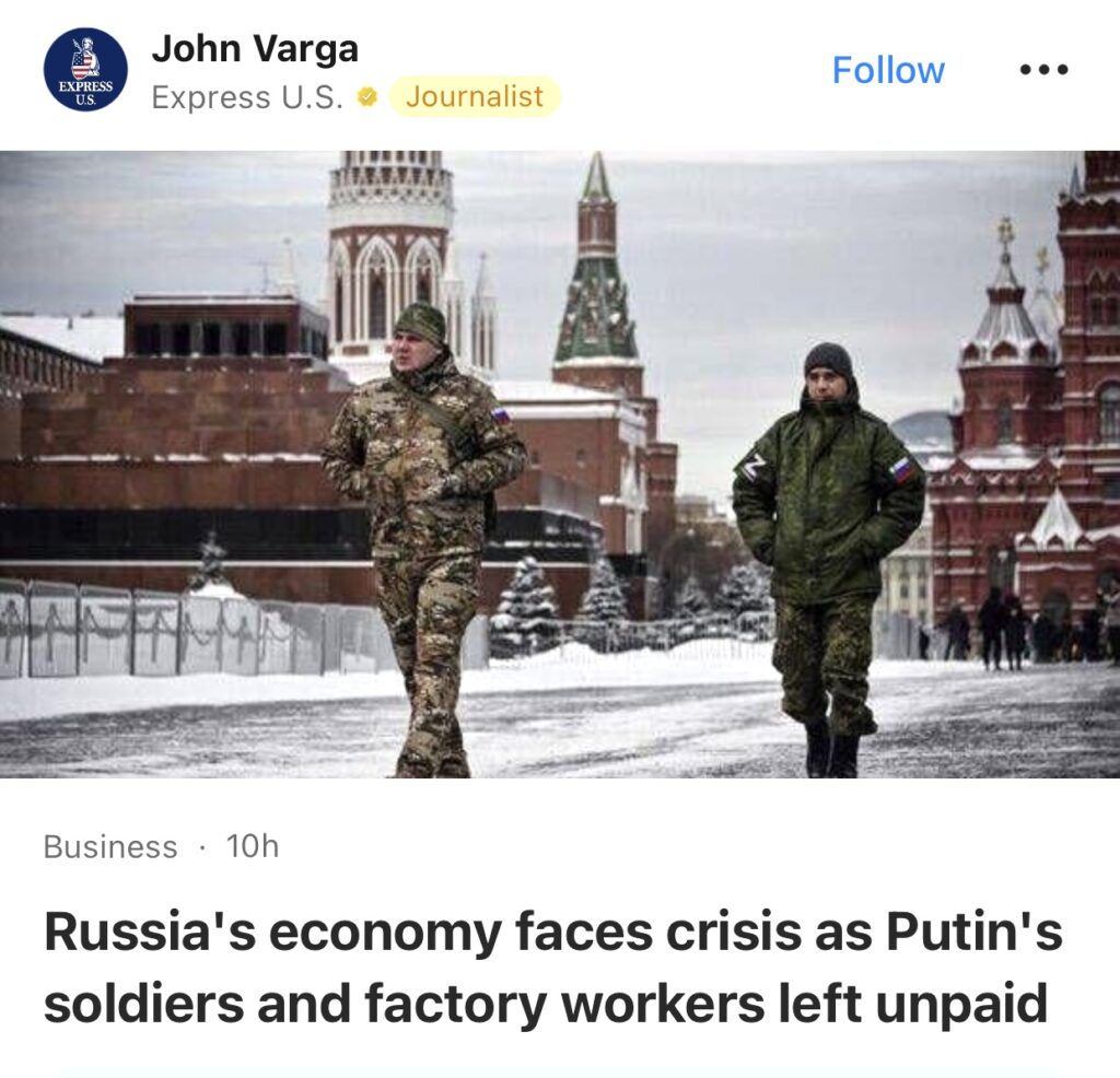9。据Express U.S. 报道,俄罗斯经济面临危机,普京的士兵和工厂工人被拖欠工资。