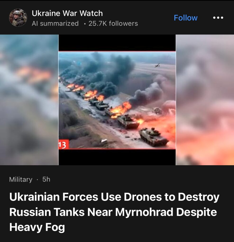 12。据Ukraine War Watch报道,尽管大雾弥漫,乌克兰军队仍使用无人机在米尔诺赫拉德附近摧毁了俄罗斯坦克。