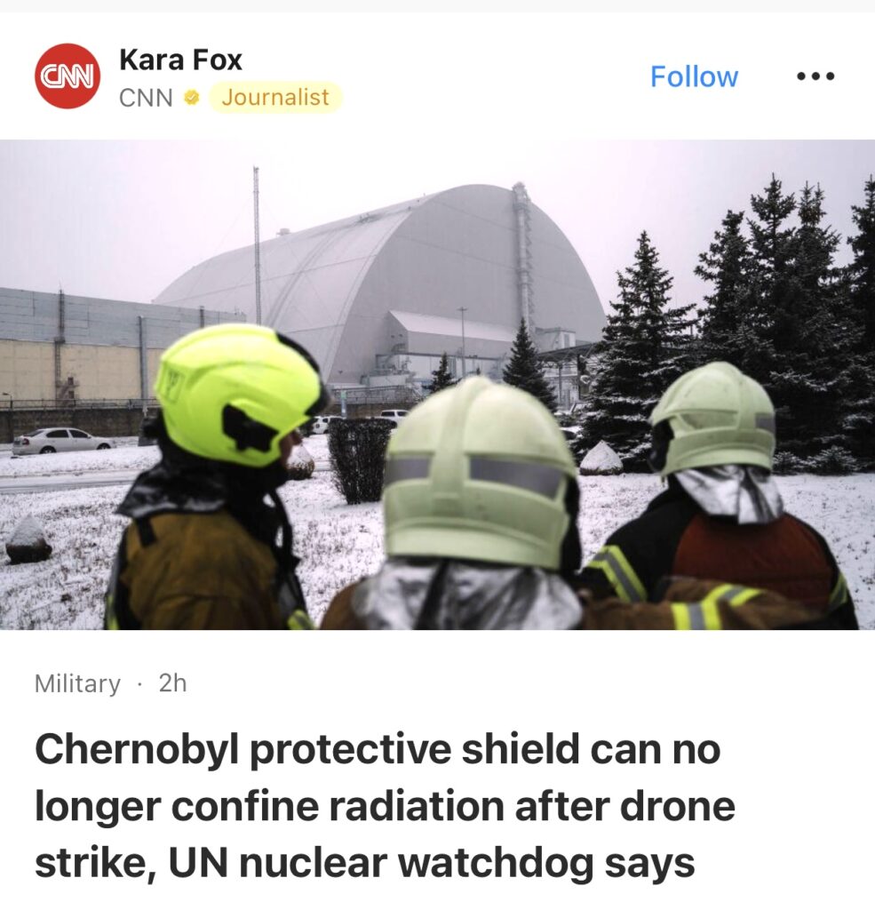 1。据CNN 报道,联合国核监督机构称,无人机袭击后,切尔诺贝利的防护罩已无法再阻止辐射扩散。乌克兰指责俄罗斯对切尔诺贝利发动了2月14日的袭击,克里姆林宫否认了这一指控。