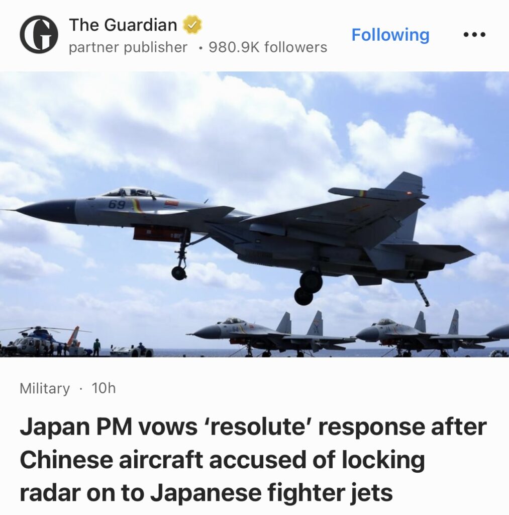 13。据The Guardian报道,日本首相誓言,将对中国飞机被指控使用雷达锁定日本战斗机一事做出“坚决”回应。