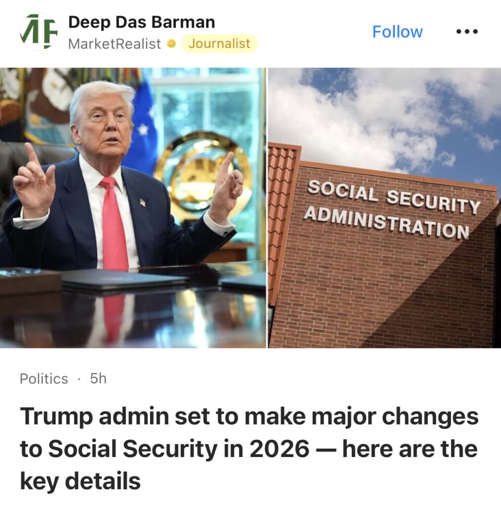 7。据MarketRealist 报道,特朗普政府计划在2026年对社会保障制度进行重大改革。
