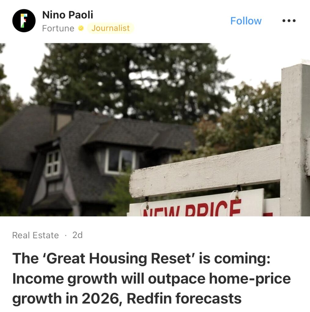 15。据Fortune报道,”住房市场大重置”即将到来:Redfin预测,2026年收入增长将超过房价增长。
