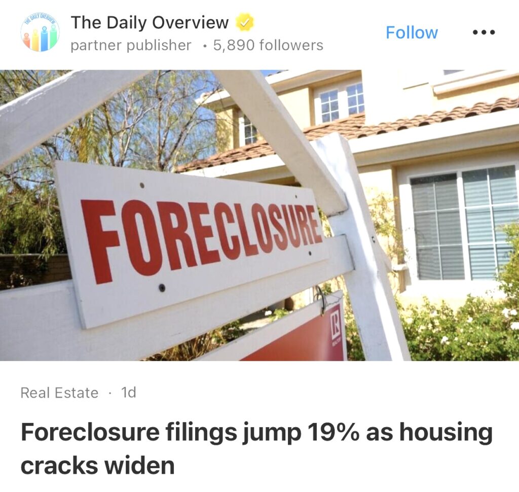 3。据The Daily Overview报道,美国房屋止赎申请数量激增19%,住房市场裂痕扩大。
