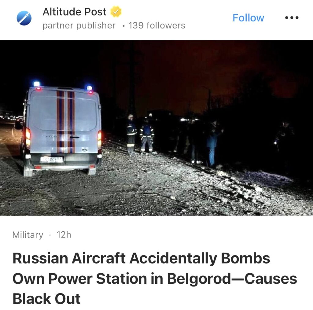8。据Altitude Post报道,俄罗斯飞机在别尔哥罗德意外炸毁自家发电站,导致停电。