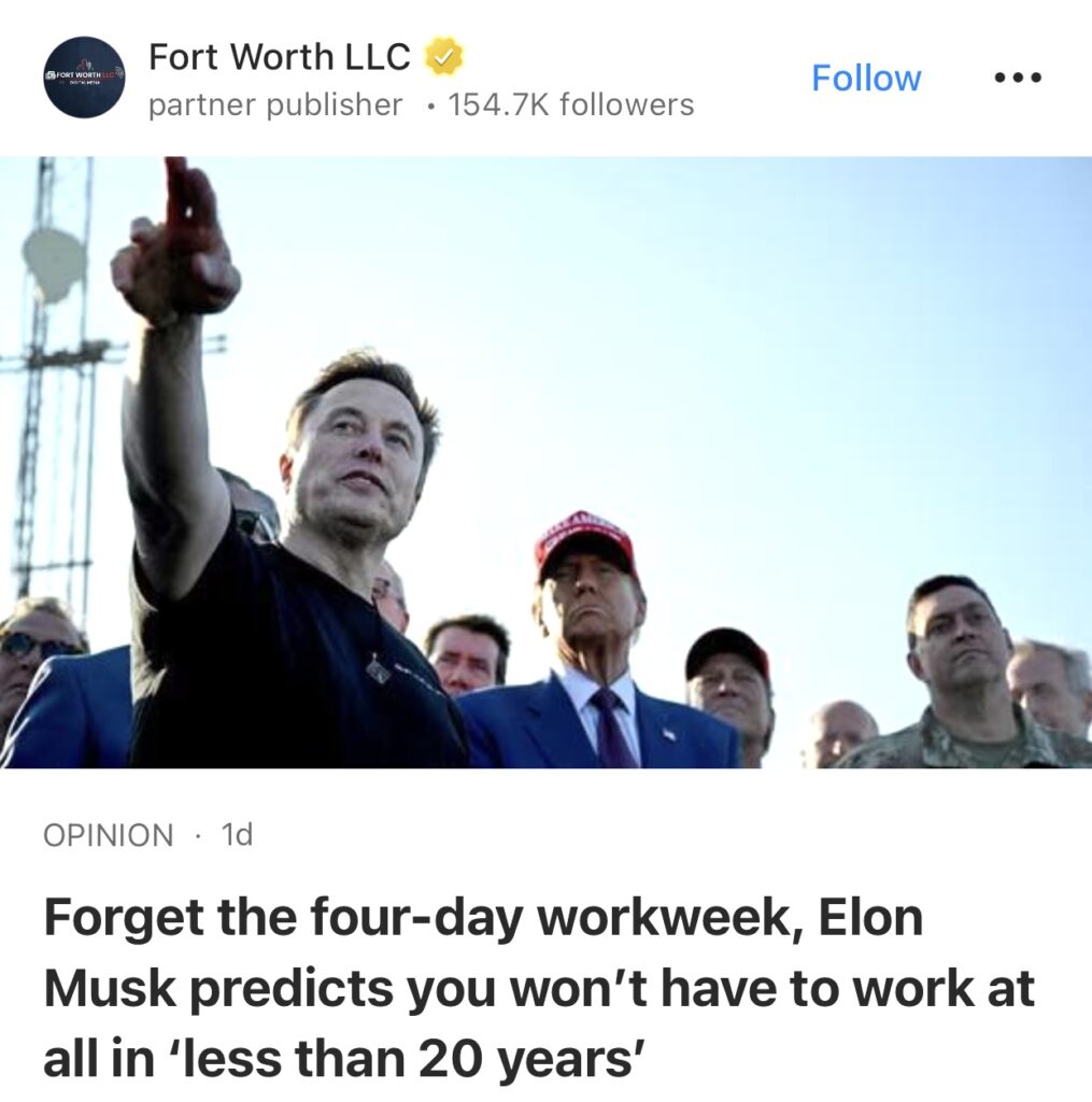 1。据Fort Worth LLC报道,别再提什么每周四天工作制了,埃隆·马斯克预测,不到20年,你将完全不用工作。