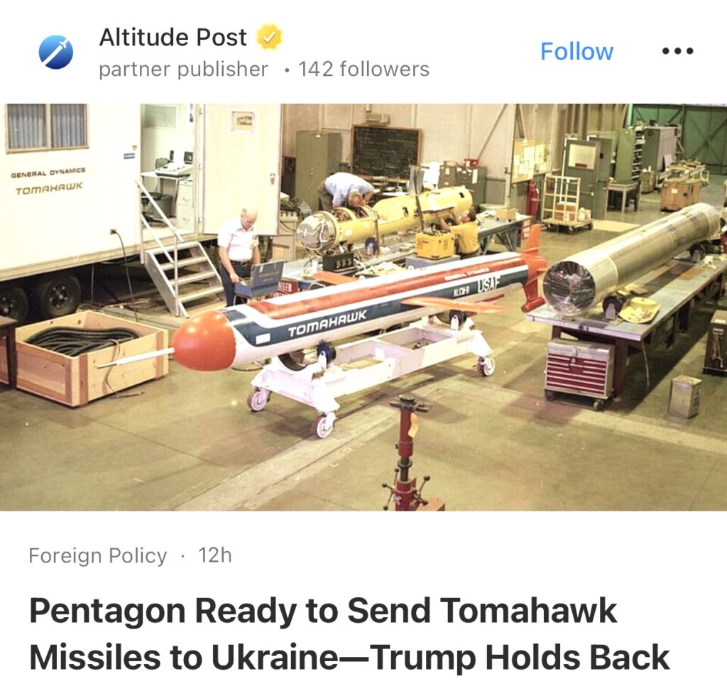 14。据Altitute Post 报道,五角大楼准备向乌克兰运送战斧导弹, 但特朗普按兵不动。
