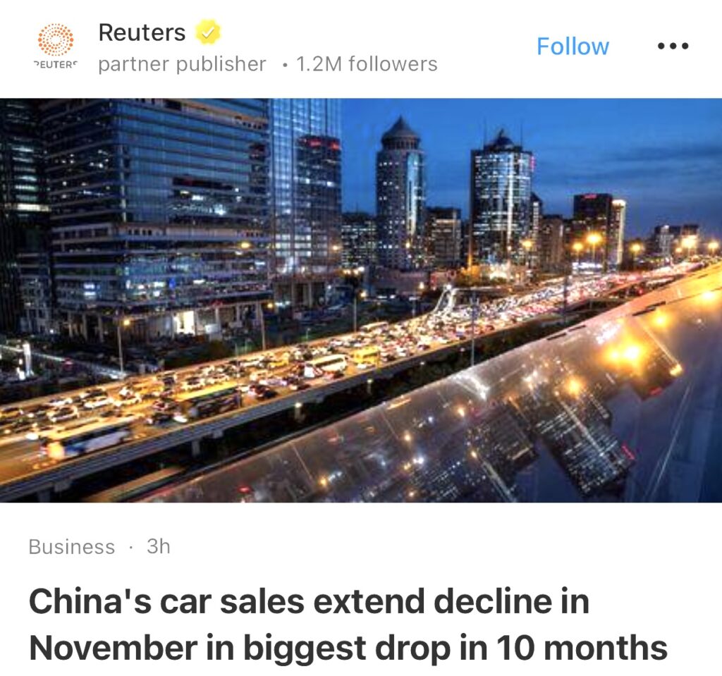 10。北京,12月8日(路透社)——周一公布的数据显示,中国11月份汽车年销量下降8.5%,连续第二个月下滑,创下10个月以来最大降幅。此前,由于政府补贴在年底逐渐减少,消费者抢购汽车的热情有所减弱。