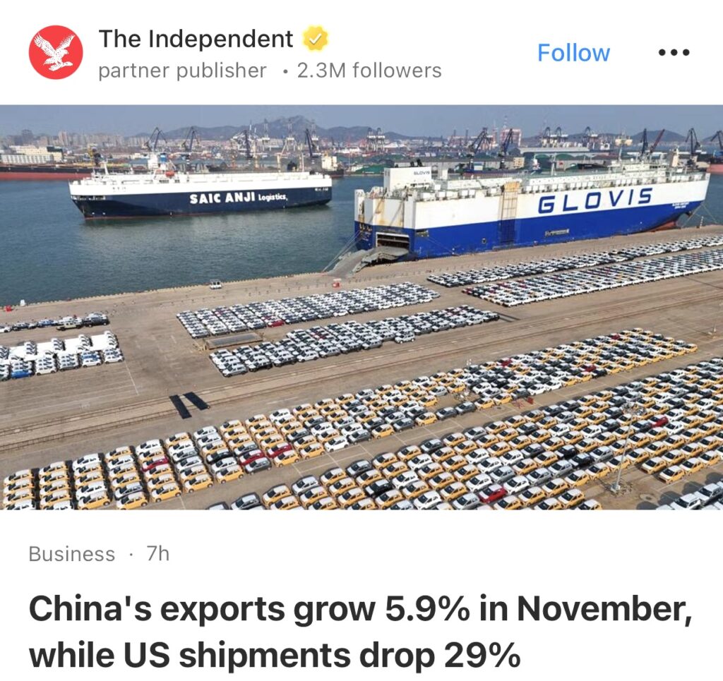 6。据The Independent报道,中国11月出口增长5.9%,而美国出口下降29%。