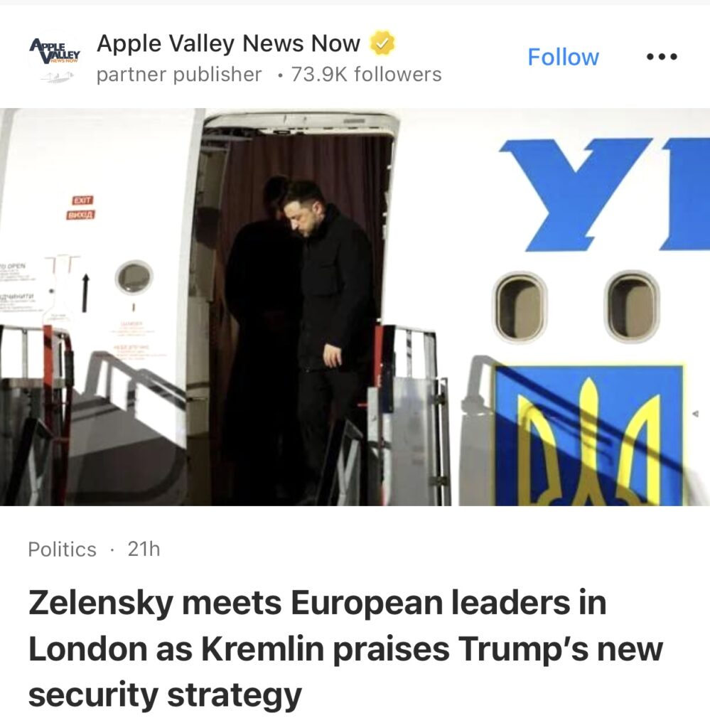 4。据Apple Valley News Now报道,泽连斯基在伦敦会见欧洲领导人,与此同时,克里姆林宫赞扬了特朗普的新安全战略。