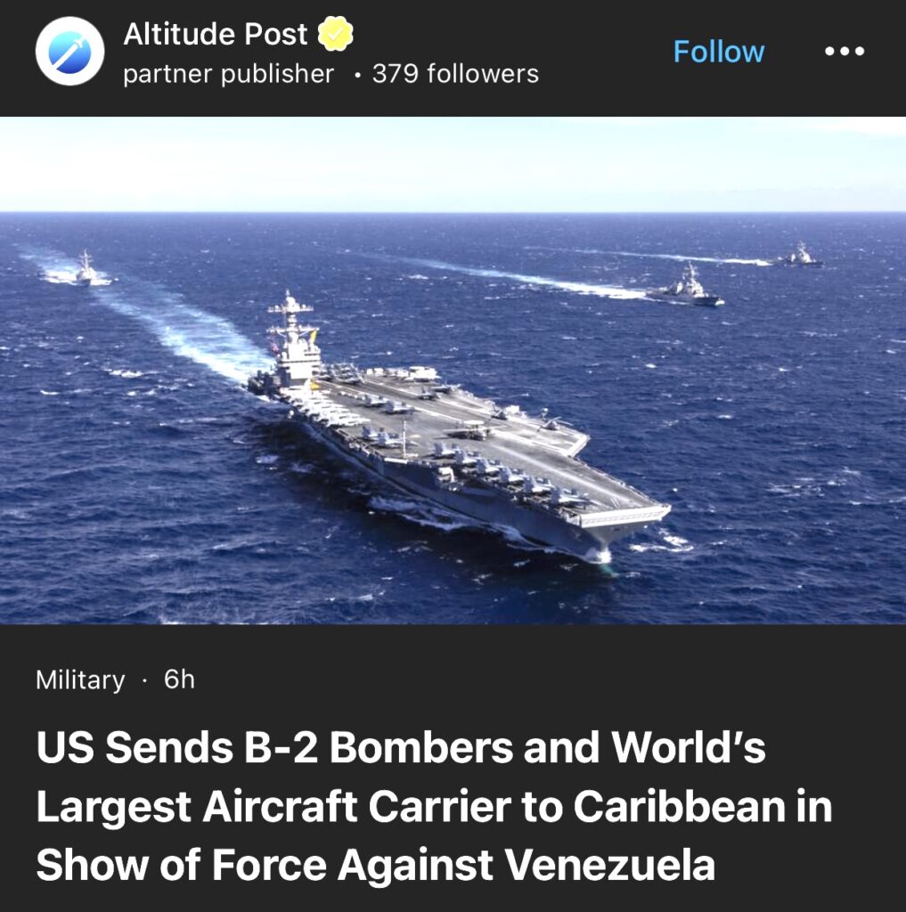 13。据Altitude Post报道,美国向加勒比海地区派遣B-2轰炸机和世界最大航空母舰,向委内瑞拉展示武力。