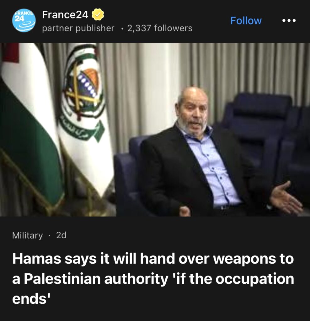 14。据France24报道,哈马斯表示,如果占领结束,它将向巴勒斯坦权力机构移交武器。