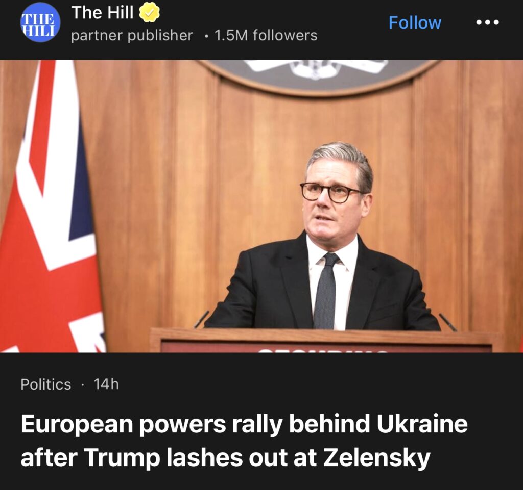 12。据The Hill报道,特朗普抨击泽连斯基后,欧洲大国纷纷声援乌克兰。