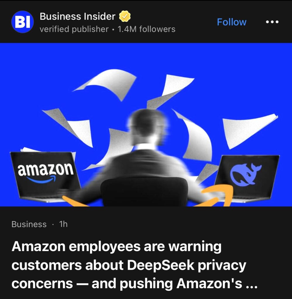 2。据Business Insider报道,亚马逊员工警告客户DeepSeek 存在隐私问题,并转而推广亚马逊自己的人工智能。