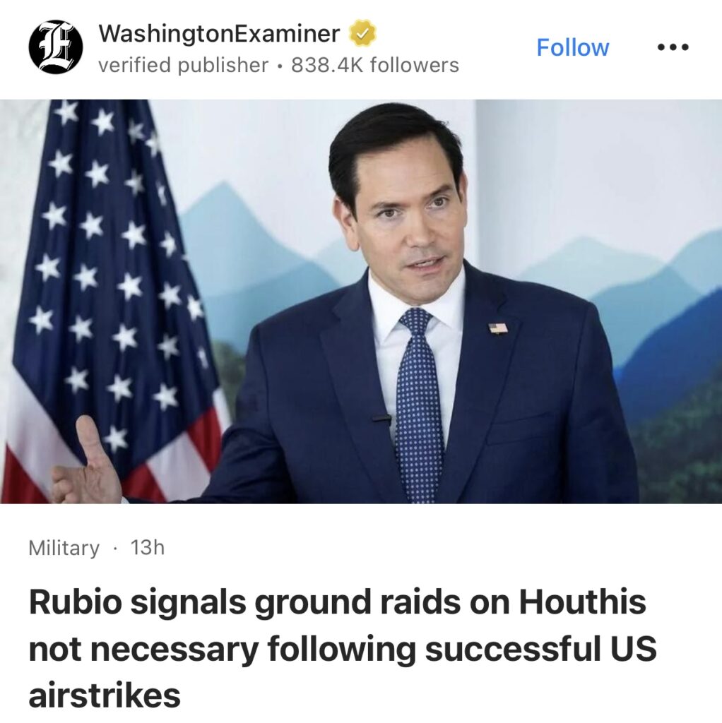 8。据WashingtonExaminer报道,美国国务卿马尔科·卢比奥周日表示,在美国对也门首都发动空袭、造成30 名胡塞武装叛乱分子死亡后,对也门胡塞武装进行地面袭击目前没有必要。