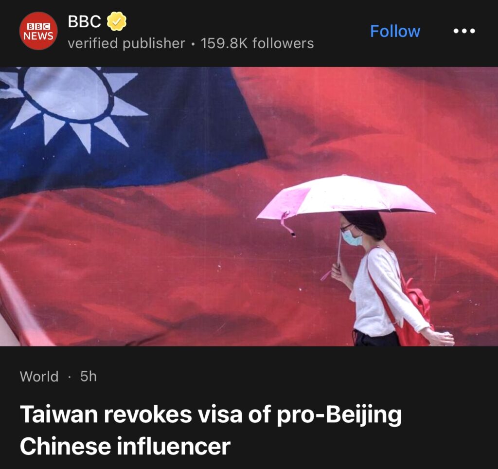 6。据BBC报道,台湾当局表示,一名居住在台湾的中国网红必须在几天内离开台湾,否则将被驱逐出境,因为她发布了支持中国武力夺取台湾的视频。此举正值两岸紧张局势加剧,人们越来越怀疑中国在台湾实施影响力行动。