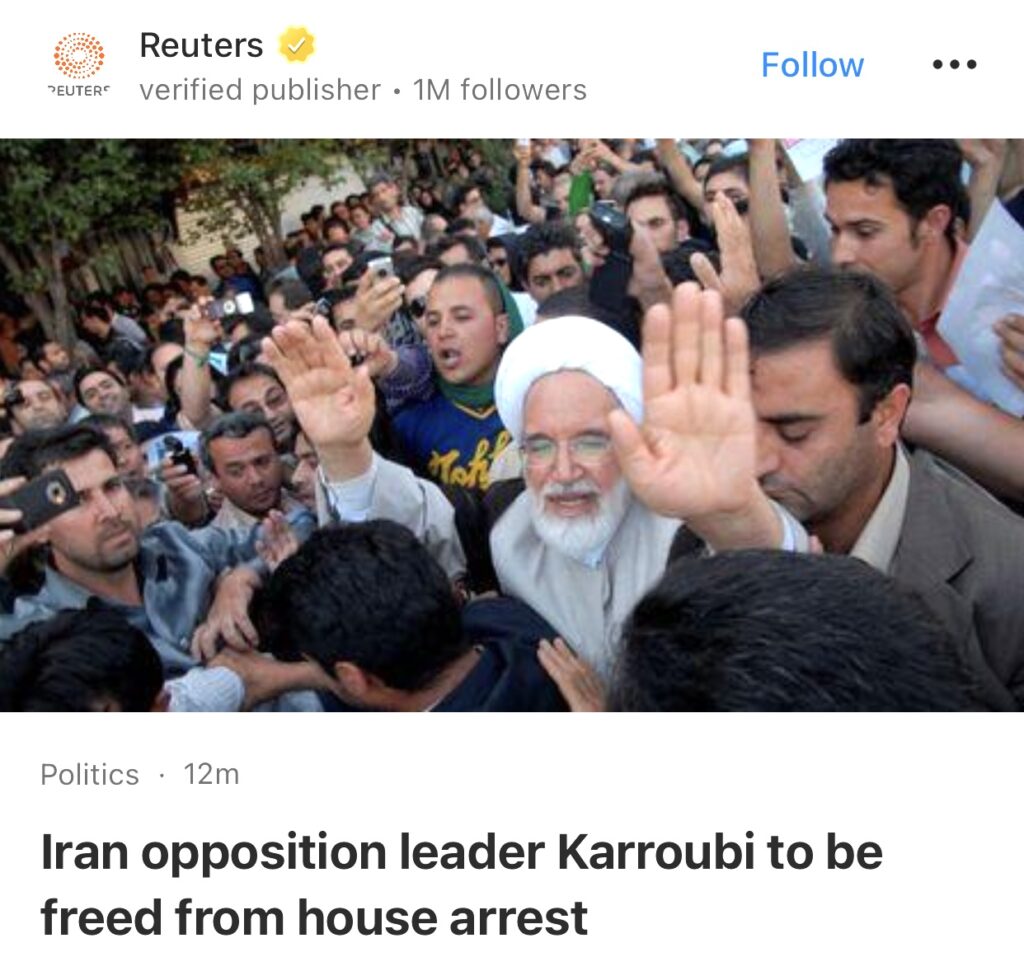 10。迪拜(路透社)——据伊朗国家和半官方媒体报道,伊朗反对派领导人迈赫迪·卡鲁比将于周一解除软禁,他因抗议总统选举结果而被拘留 14 年。
