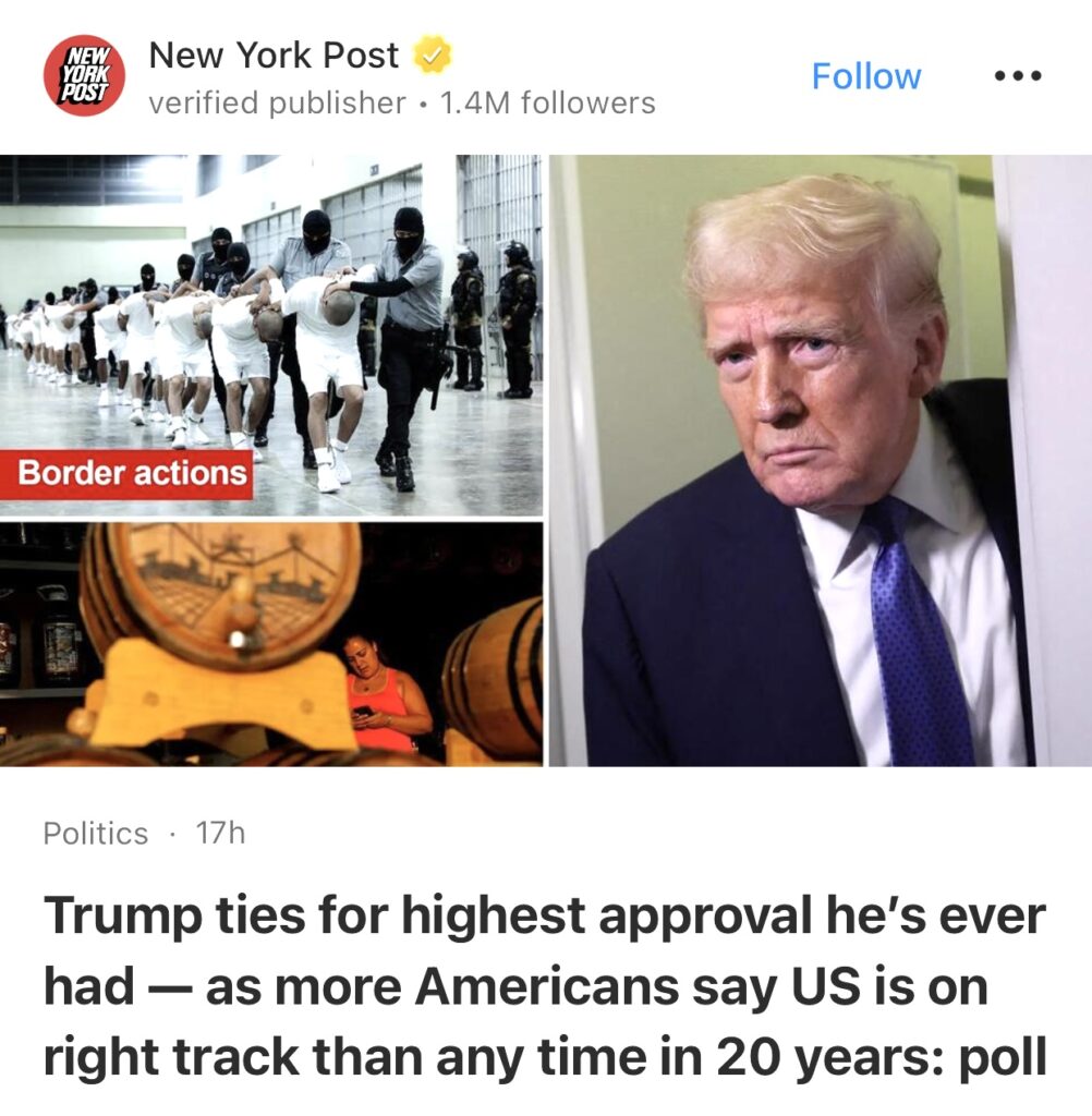 11。据New York Post报道,特朗普支持率创历史新高——民意调查显示,认为美国走在正确道路上的美国人数量创 20 年来新高。