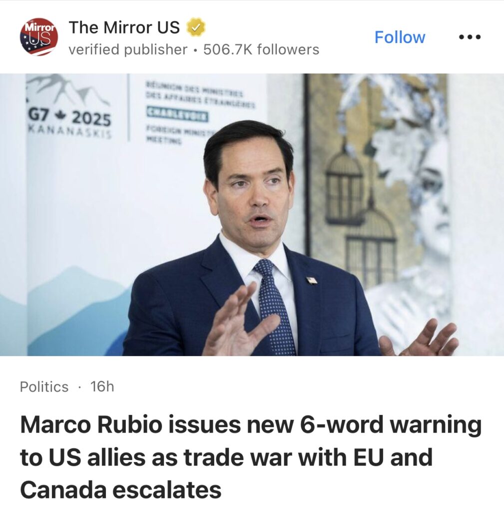 13。据The Mirror US报道,随着与欧盟和加拿大的贸易战升级,马尔科·卢比奥向美国盟友发出新的六字警告。卢比奥出现在哥伦比亚广播公司的新闻节目《面向全国》中,他用六个英文字明确地说:(What we have now cannot continue.) ”我们现在的情况不能再继续下去了。”