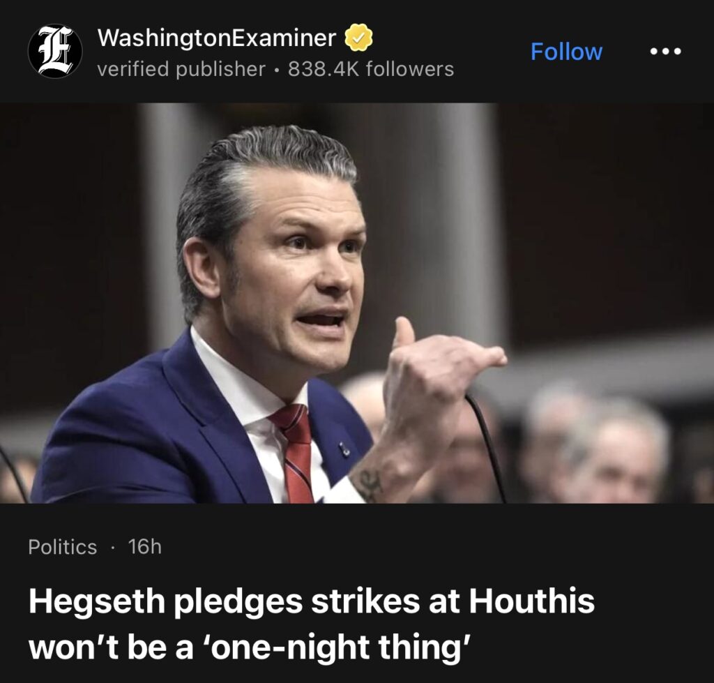 5。据WashingtonExaminer报道,美国国防部长皮特·赫格塞斯说,最近在也门对胡塞武装的袭击是为了保护美国的资产,而不是为了推动也门内战的任何一方。这次袭击代表了唐纳德·特朗普总统和他的前任乔·拜登对胡塞武装在红海袭击美国船只的反应不同。超过 30 名胡塞叛军在袭击中丧生。