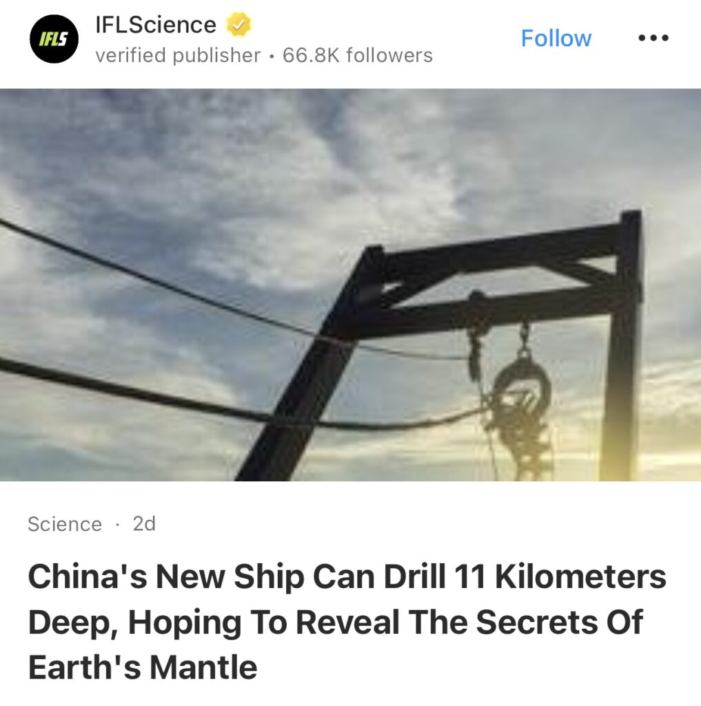 12。据IFLScience报道,中国新船可钻探11公里深,有望揭示地幔的秘密。