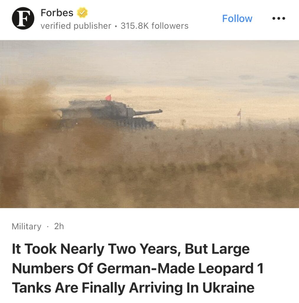7。据Forbes报道,历时近两年,大批德制豹1坦克终于抵达乌克兰。