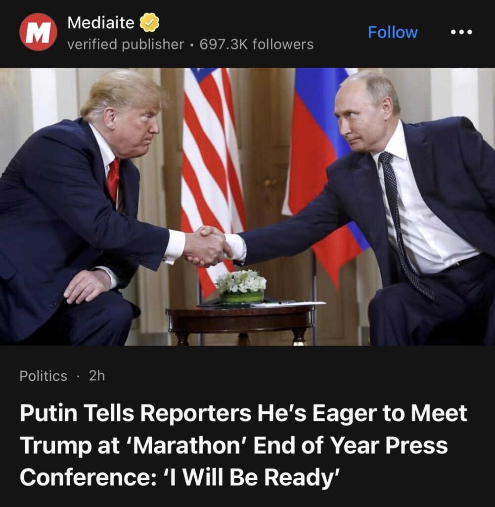 10。据Mediaite报道,普京告诉记者,他渴望在“马拉松”年终新闻发布会上与特朗普会面,称,”我会做好准备”。