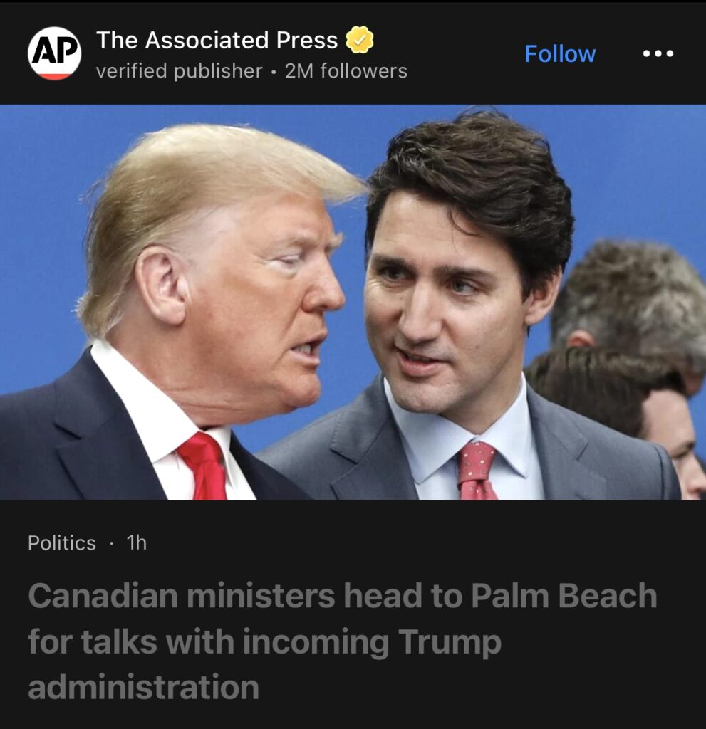 13。多伦多(美联社)——加拿大两名高级内阁部长正在访问棕榈滩,与即将上任的唐纳德·特朗普政府讨论边境安全和贸易问题。特朗普威胁对所有加拿大产品征收关税。