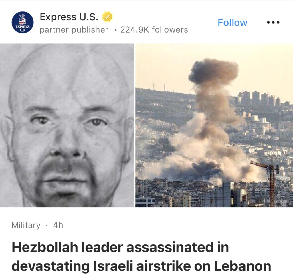 2。据Express U.S报道,真主党领导人在以色列对黎巴嫩发动的毁灭性空袭中遇刺身亡。