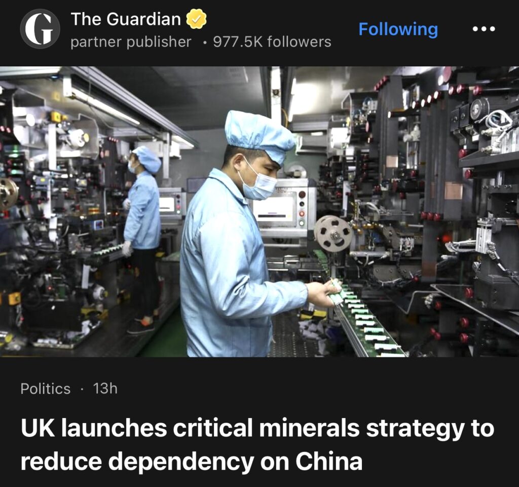 14。据The Guardian报道,英国推出关键矿产战略,以减少对中国的依赖。