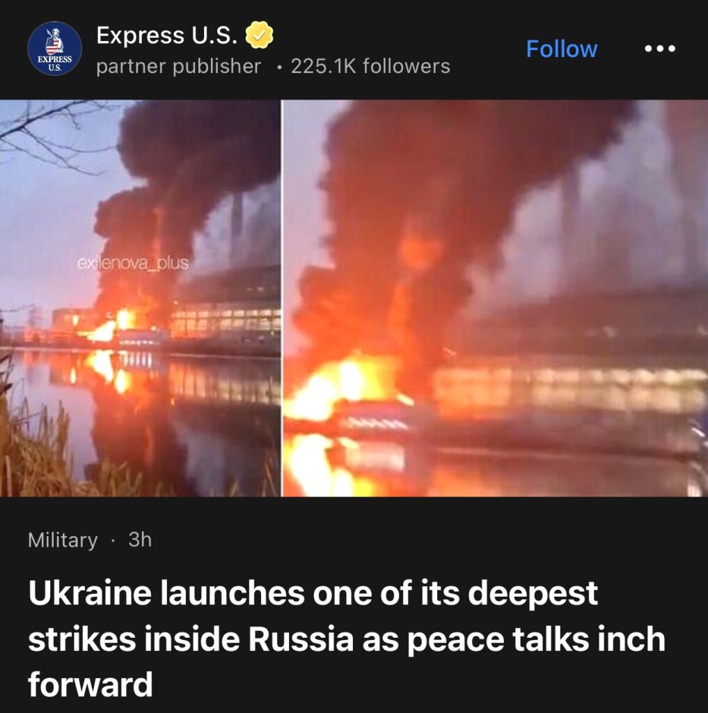 12。据Express U.S.报道,乌克兰对俄罗斯境内发动了迄今为止最深入的打击之一,与此同时,和平谈判取得进展。