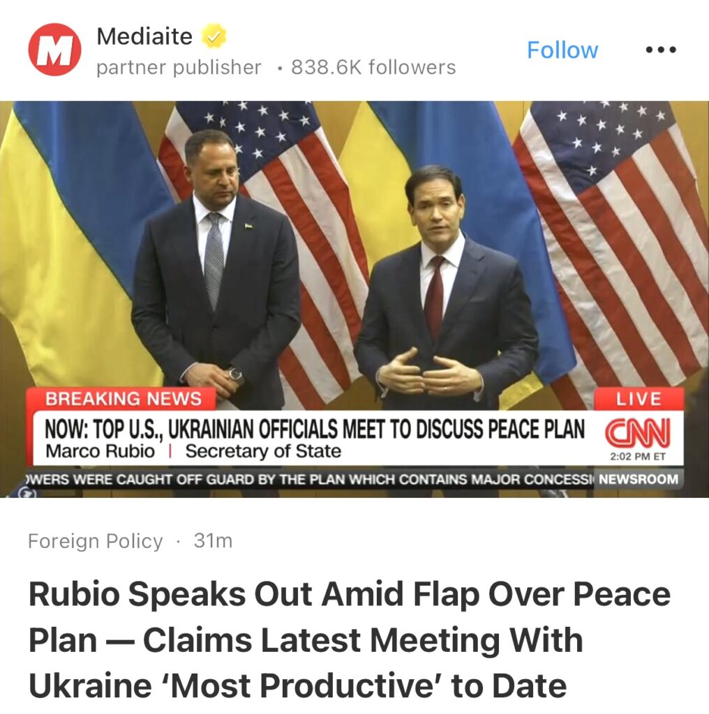 5。据Mediaite报道,鲁比奥就和平计划风波发声——称与乌克兰的最新会晤是迄今为止“最富有成效的”。